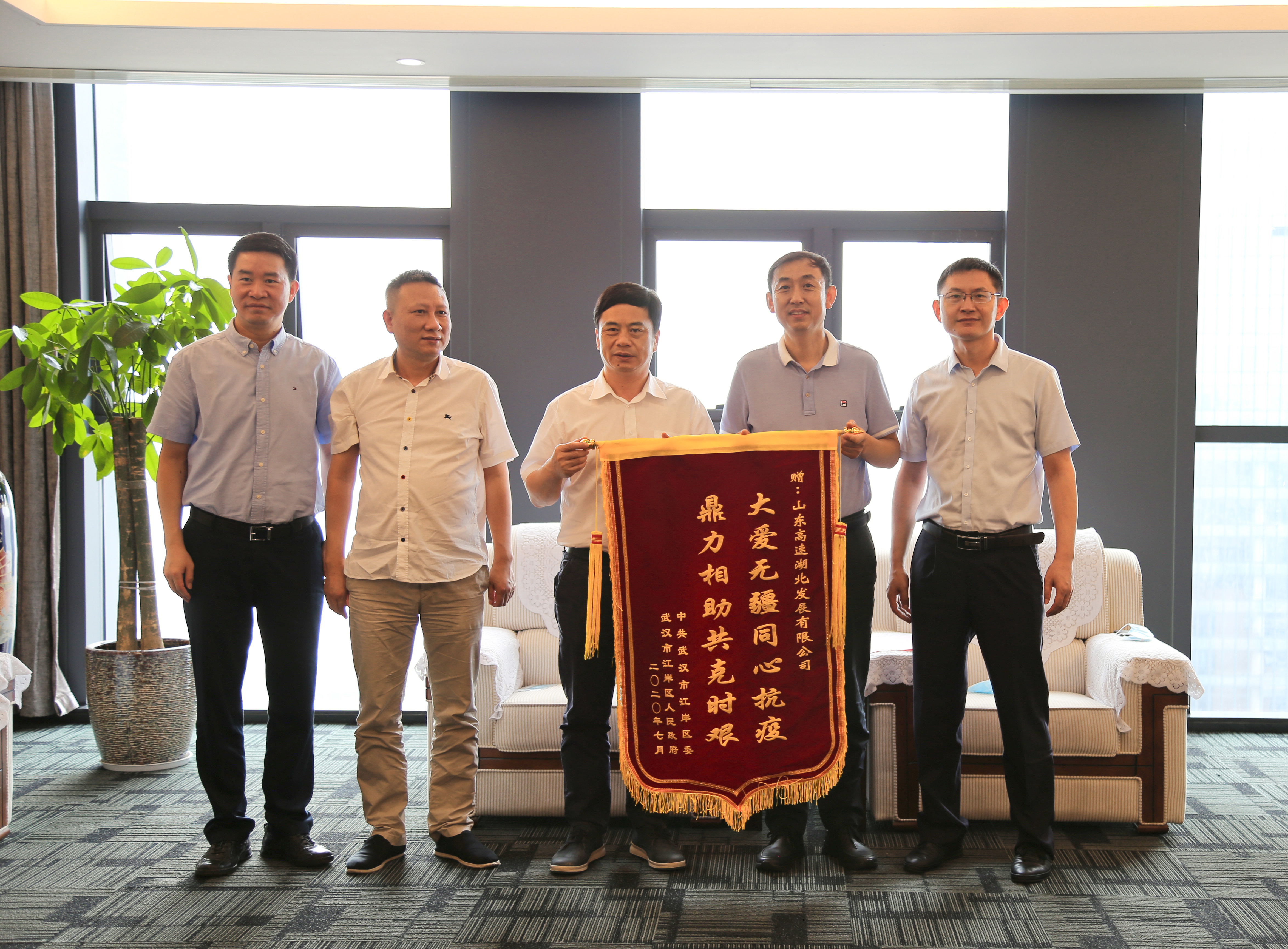 7月14日上午,長江新城管委會主任、江岸區(qū)委書記馬澤江為公司送來“大愛無疆同心抗疫,鼎力相助共克時艱”錦旗,并與公司黨委書記、董事長隋進浩座談交流。